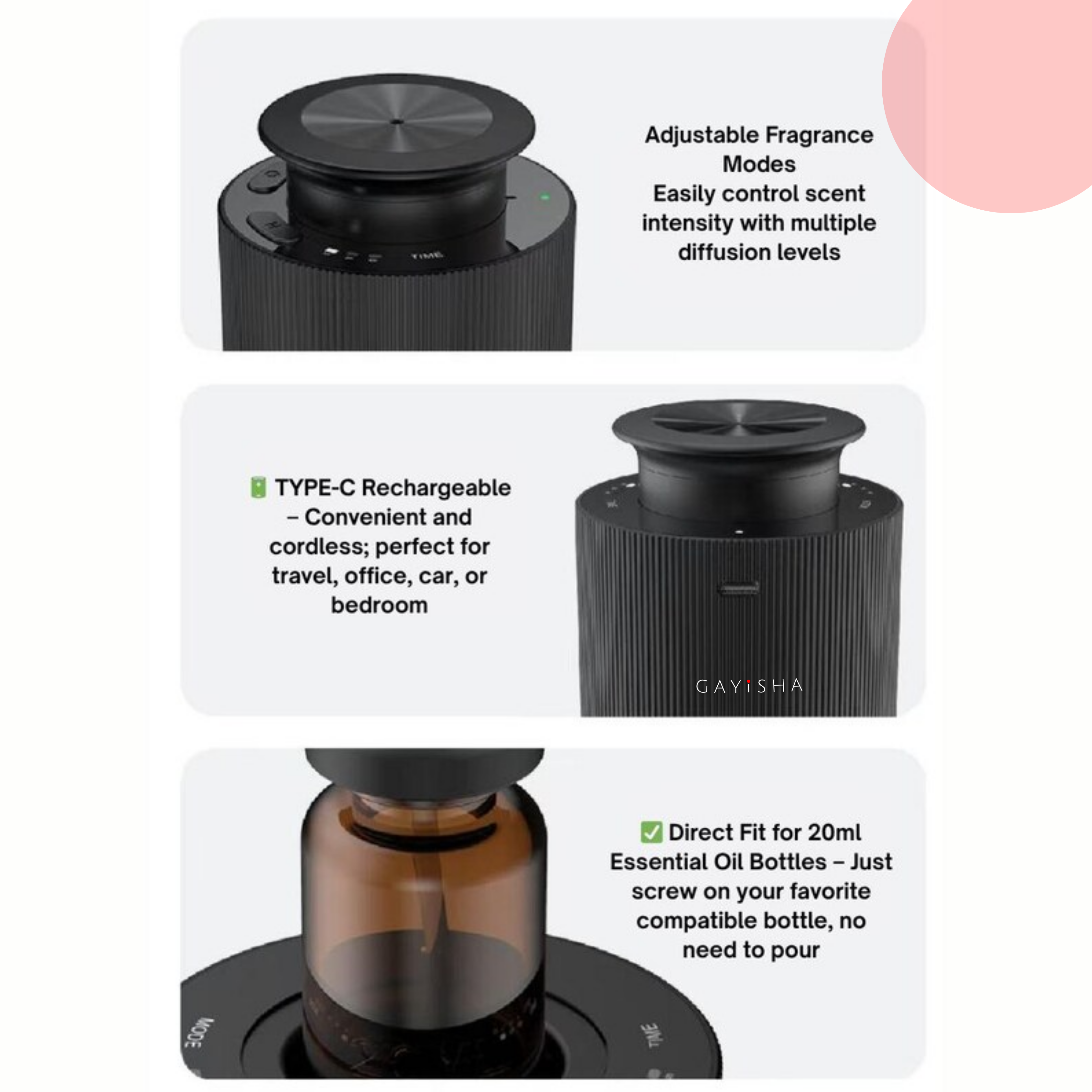 Read moreAt Gayisha, every scent is crafted to create an experience—whether it’s the calm of citrus, the warmth of coffee & vanilla, or the elegance of divine florals. From your home to your car, our diffusers are designed to blend seamlessly with your lifestyle, filling every corner with lasting fragrance.